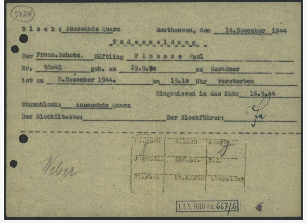 « Lors de son retour de l’interrogatoire, Monsieur Finance m’a paru fort abattu ; il portait de nombreuses traces de coups et un peu de sang sous la lèvre inférieure. Peu après son retour dans notre chambre, il repartit à destination de Xonrupt-Longemer pour aller montrer aux Allemands le lieu où étaient cachées des armes. Son retour eut lieu vers 23 heures ; il était exténué de fatigue et nous informait qu’il avait encore été frappé sur le lieu de découverte des armes. Le lendemain, au cours des conversations qui portèrent sur les circonstances de son interrogatoire, il nous rapporta que, bien décidé à tout nier, il avait été tout d’abord frappé dans la pièce où se passait l’interrogatoire, qu’ensuite il avait été descendu dans une salle propre à la bastonnade où il avait souffert. Remonté et interrogé à nouveau, il nia toujours ; ce que voyant, ses bourreaux s’apprêtèrent à le descendre à nouveau à la salle de torture et qu’à ce moment, Monsieur Riche se serait avancé et lui aurait dit : “Ne te fais pas tuer, Finance, avoue, ils savent tout !”, et ce serait à la suite de cette intervention improvisée que Monsieur Finance aurait avoué. »