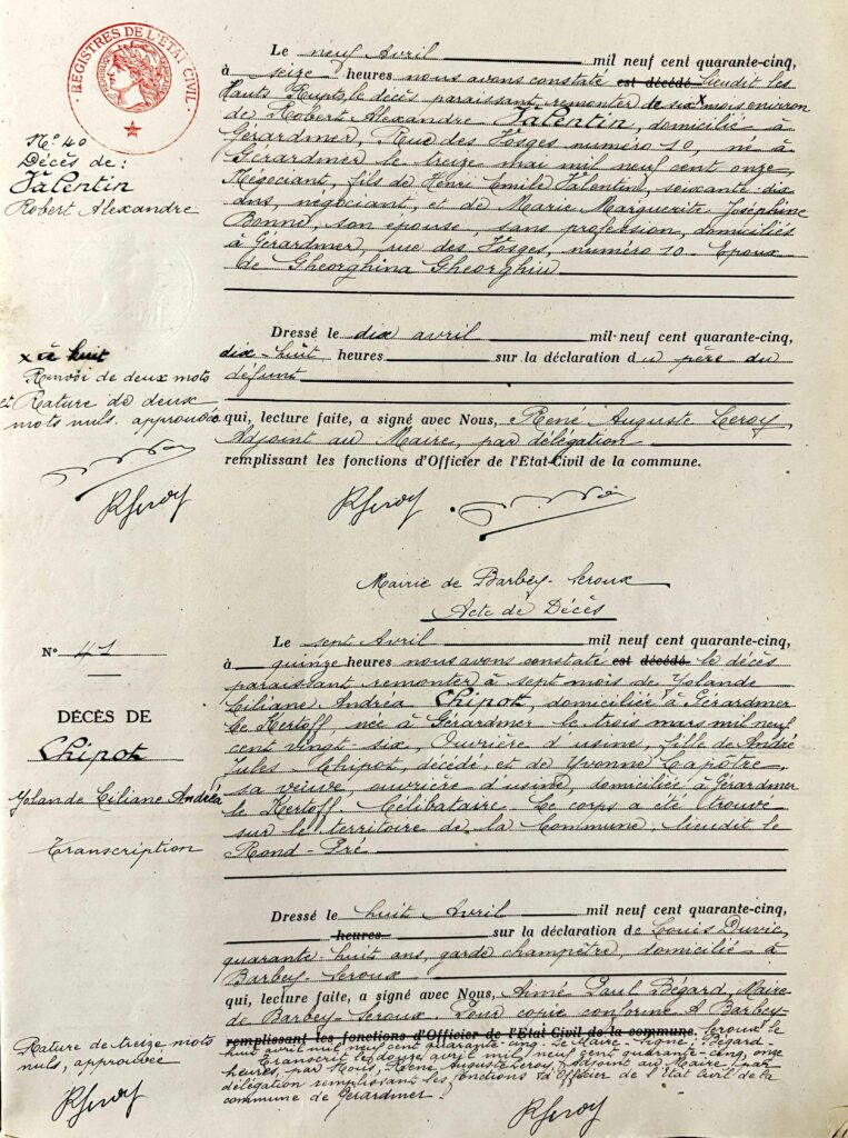 Si Chrétien et les Singer ont réussi à fuir et à garder la vie sauve, d’autres collaborateurs n’ont pas eu cette chance. Aux Hauts-Rupt, sur le chemin que nous appelons aujourd’hui la route des 17, Robert Alexandre Valentin, le fils d’un épicier de Gérardmer de la rue des Vosges, est assassiné par la Résistance à la fin du mois d’août. Son corps ne sera retrouvé que le 9 avril 1945. Quelques jours plus tôt, c’est le corps de la jeune Yolande Chipot, dix-neuf ans, qui est retrouvé dans la forêt de Barbey-Seroux et dont le décès semblait remonter au mois de septembre 1944. Yolande Chipot qui vivait avec sa famille au Kertoff est accusée d’avoir entretenu des relations intimes avec les soldats des troupes d’occupation.