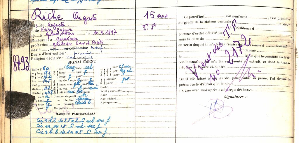 Gustave Riche purgera le début de sa peine à la maison d’arrêt de Nancy avant de rejoindre la centrale de Clairvaux dans l’Aube. Le crâne rasé, la tunique rayée des prisonniers et les sabots de bois aux pieds, il y reste jusqu’en octobre 1950 avant de finir sa peine dans le Tarn, à la prison de Saint-Sulpice et en dernier lieu à Remiremont. Tout au long de sa détention, il continue à produire lettres et explications pour tenter de se disculper, en vain.