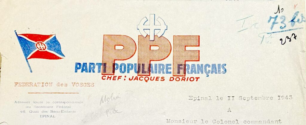À une date que mes souvenirs ne me permettent pas de fixer, j’ai trouvé un papier, d’un format semblable à celui d’une carte postale, avec l’inscription « Parti populaire français. Le coin gauche, si je ne me trompe pas, avait été enlevé, ce qui semble indiquer un contrôle à l’entrée d’une réunion, qui avait vraisemblablement eu lieu un des jours précédents. Cette carte était établie au nom de Monsieur Riche, Gustave, garde forestier à la Rayée. Connaissant à Riche, une mentalité toute particulière, j’avais minutieusement conservé ce papier ainsi que d’autres, mais en novembre 1944, lorsque j’étais déporté le document et les renseignements que je possédais furent détruits par l’incendie volontaire des Allemands.