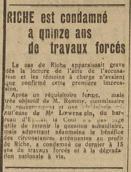 Le 9 mai 1946, l’audience s’ouvre. Pendant deux jours, témoins et avocats se succèdent à la barre. Au terme des débats, Gustave Riche est condamné à quinze ans de travaux forcés et frappé d’indignité nationale à vie. Dans cette justice d’exception, l’accusé ne peut pas faire appel et dispose de seulement 24 heures pour se pourvoir en cassation.
