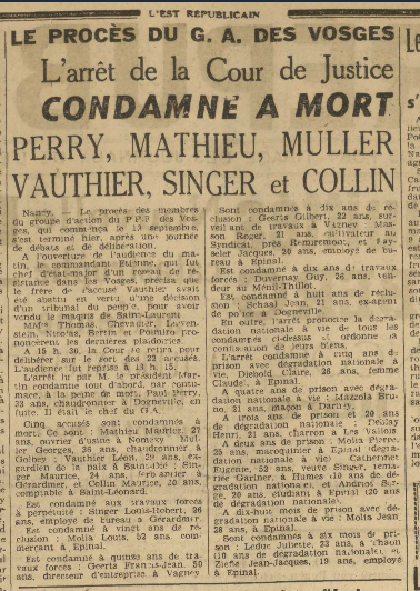 Le procès du Groupe d’action du PPF est un événement important. L’enquête concerne pas moins de 22 prévenus. Le dossier aux Archives départementales de Meurthe-et-Moselle représente plus d’un mètre linéaire d’archives. L’enquête est longue et fastidieuse tant les actions menées par ce Groupe d’Action sont nombreuses. On les signale un peu partout dans les Vosges : à Rupt-sur-Moselle, Gérardmer, Monthureux-sur-Saône, Corcieux, Le Thillot, Charmes, entre juillet et août 1944. Pour ce qui concerne le rôle du GA à Gérardmer, on retrouve dans les pièces de procédure une confrontation entre le fils du peintre de la rue du Casino, J-F. M. et Robert Singer :